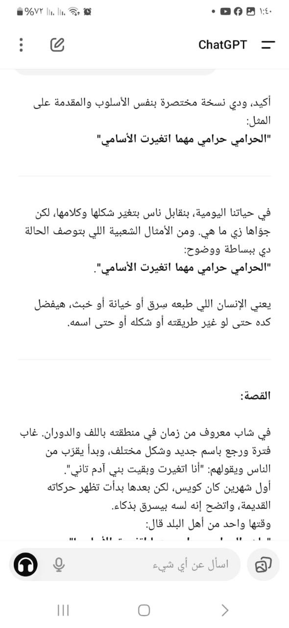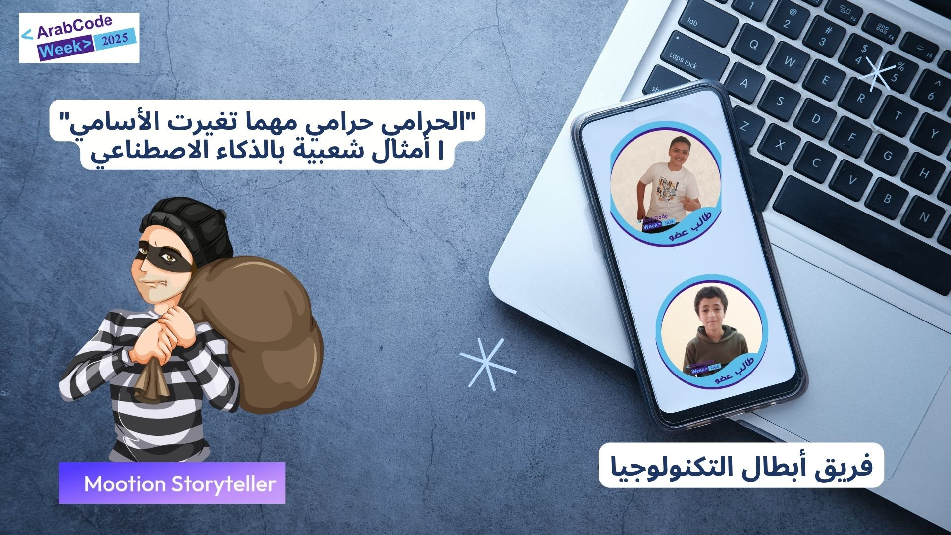 ضمن أنشطة الأسبوع العربي للبرمجة، قدّم فريق أبطال التكنولوجيا (عمر ومحمد) مثلًا شعبيًا مصريًا مشهورًا باستخدام أدوات الذكاء الاصطناعي الحديثة. هذا المثل يُقال عندما يحاول شخص تغيير شكله أو اسمه أو هويته ليُخفي أفعاله السيئة، لكن طبيعته تظل كما هي. فالطبع لا يمكن أن يتغير بالاسم أو المظهر.